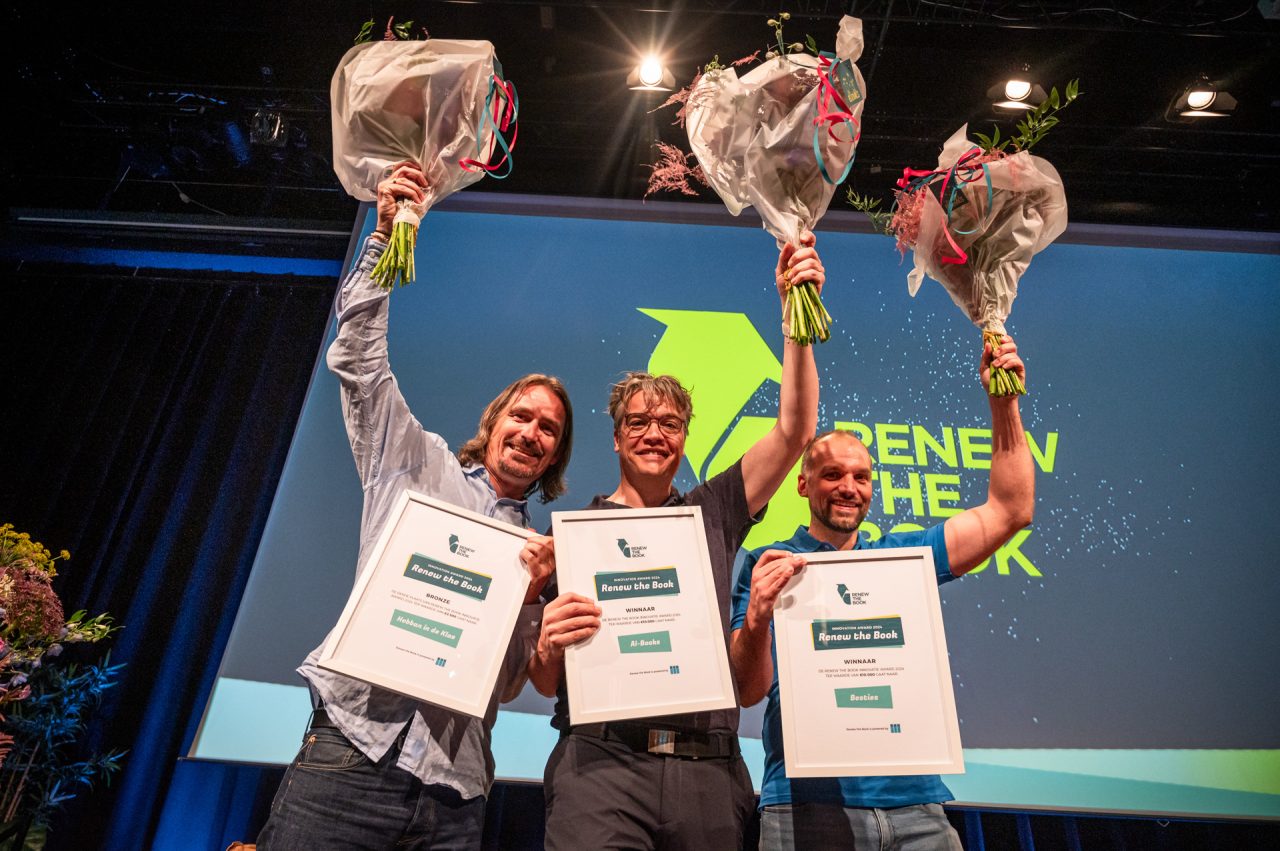 Amsterdam, 27 juni 2024 – In Pakhuis de Zwijger te Amsterdam zijn zojuist De AI-Boeken van Maven Publishing en Besties luisterkaarten tot winnaar gekroond van de vijfde editie van Renew the Book. Dit is de eerste keer sinds de oprichting van Renew the Book innovatieprijs dat de jury twee winnaars kiest. In het juryrapport is te lezen dat beiden vernieuwingen van dermate hoge kwaliteit waren dat er geen keuze kon worden gemaakt. Zowel AI-Boeken als Besties voldoen aan alle gestelde criteria en zijn gedurfde innovaties ieder op hun eigen terrein. Twee vernieuwingen met veel innovatiekracht. Vandaar dat de jury dit jaar niet anders kon dan deze twee tot winnaar te kiezen. Daarnaast werd ook de Pioniersprijs uitgereikt aan de vernieuwing Hebban in de klas. Deze prijs wordt uitgereikt door de deelnemers aan het GAU Onboarding Programma. Dat is een initiatief van de GAU om talentvolle nieuwe boekenvakkers wegwijs te maken in het vak. De deelnemers reiken de pioniersprijs uit aan de inzending die in hun ogen zeer veelbelovend is voor het vak.